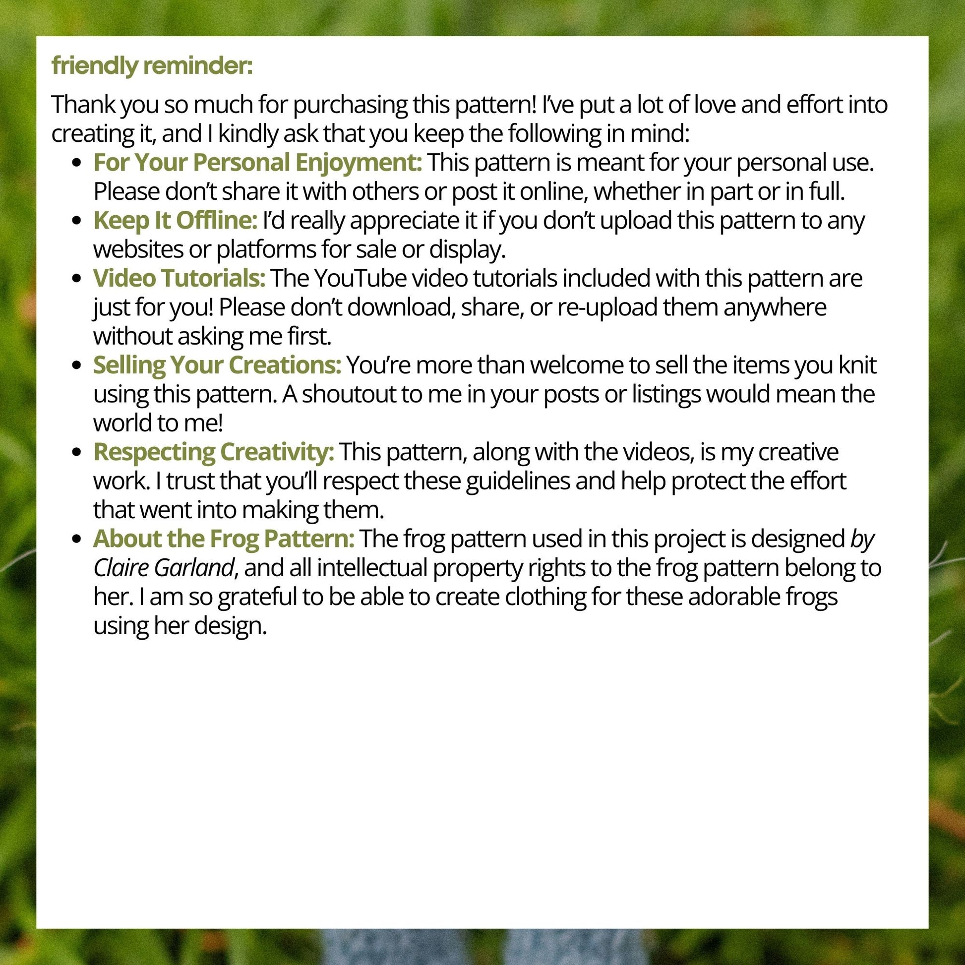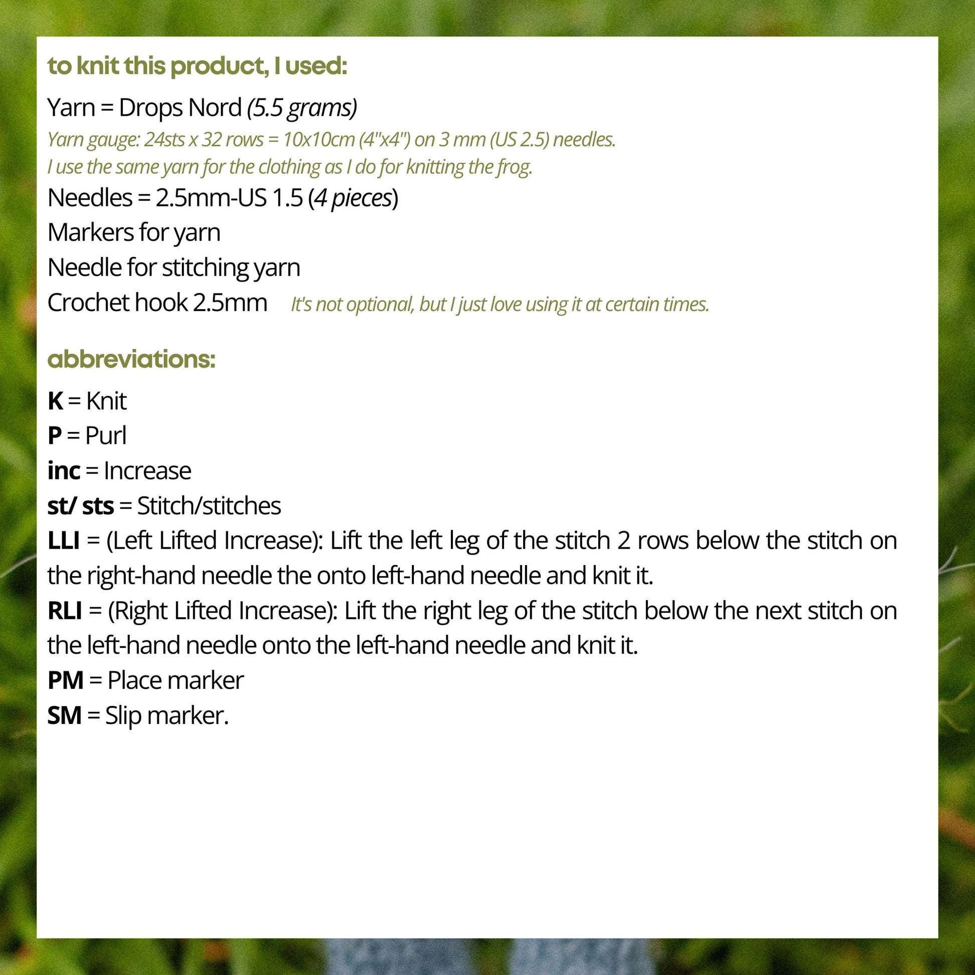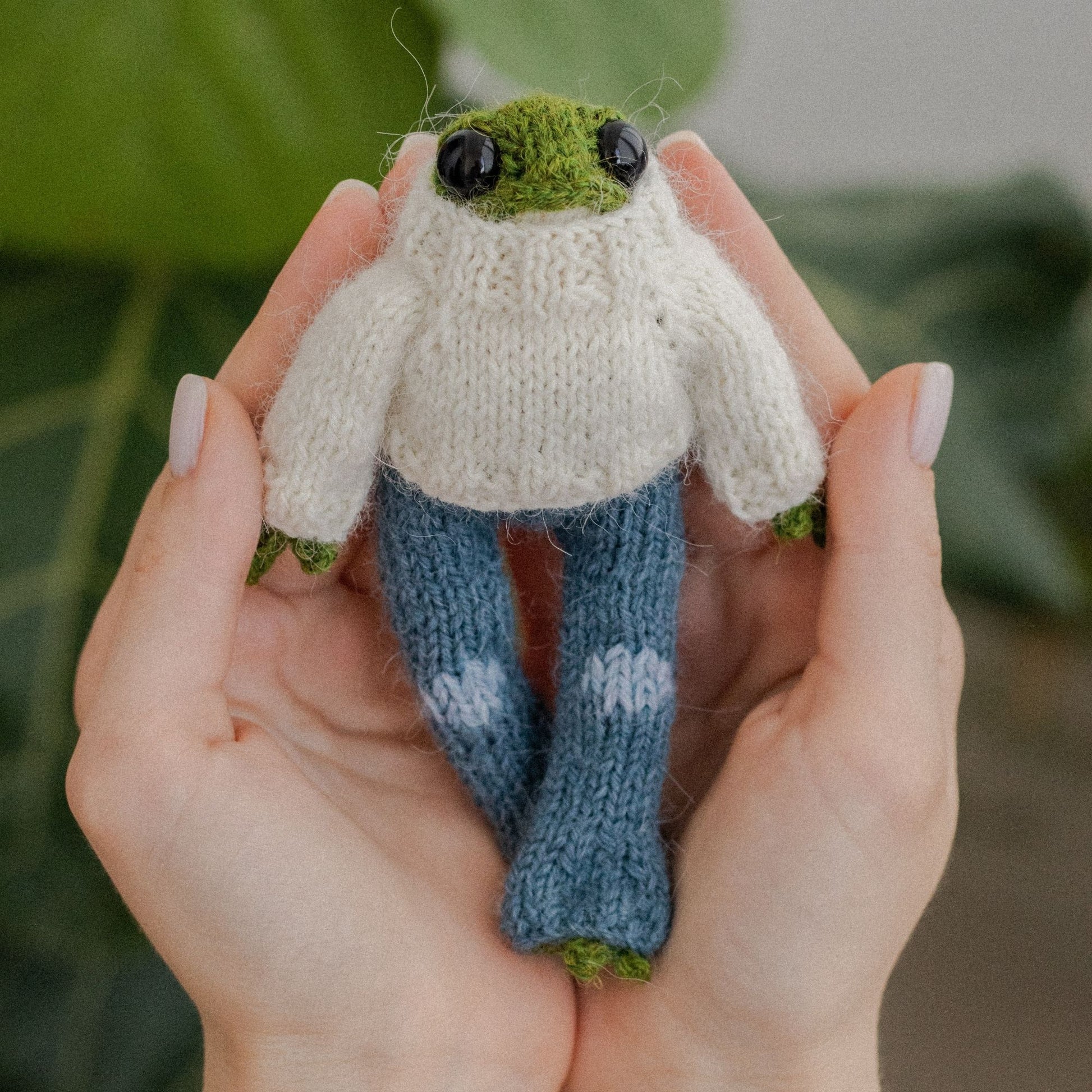 A charming and detailed knitting pattern for a frog sweater, designed for a 5.1-inch (13 cm) knitted frog. Perfect for knitters who enjoy creating cute frog clothes and toy outfits.