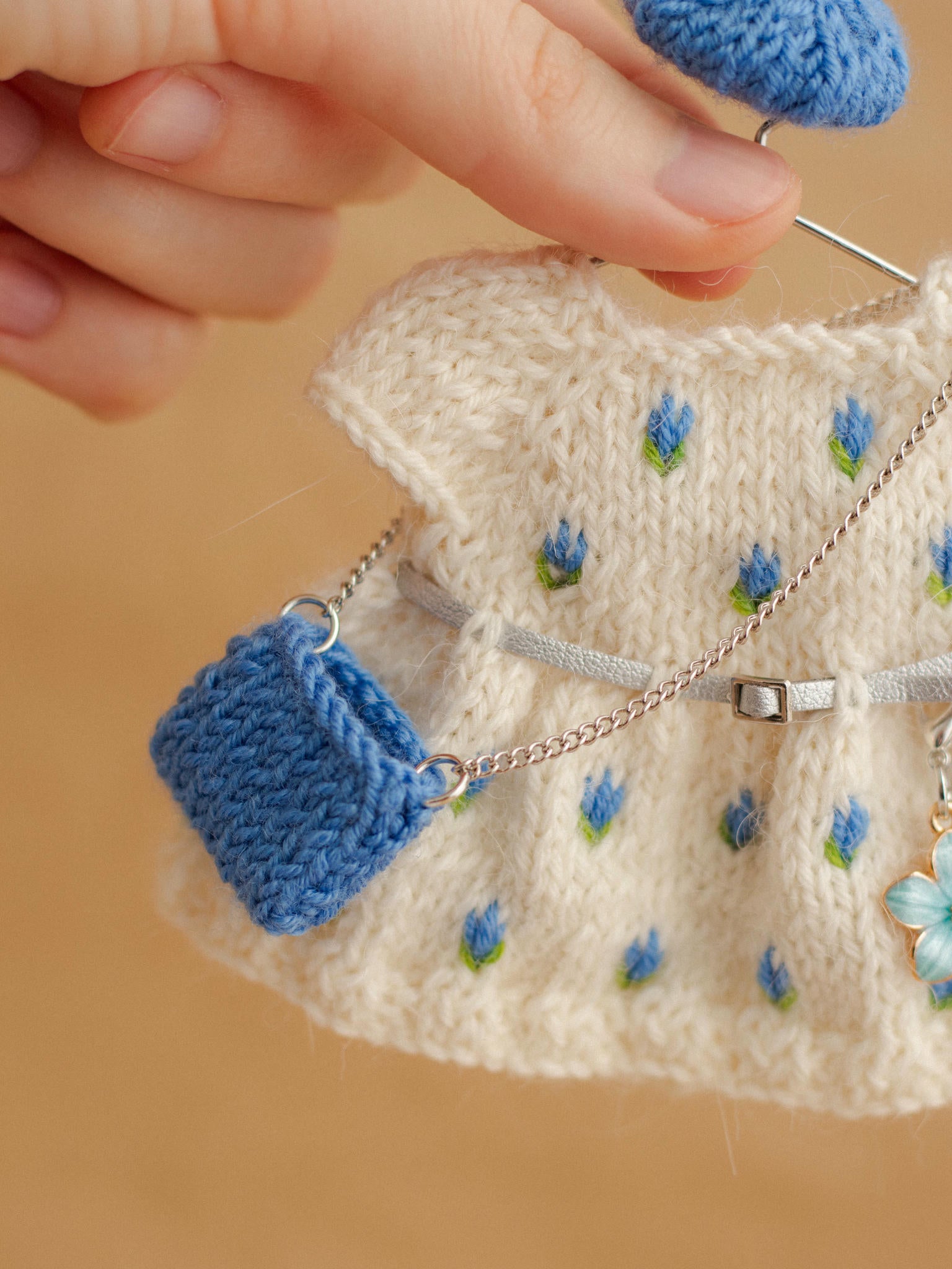 - Chain Crossbody Bag: A matching blue knitted purse with a delicate metal chain for a sophisticated look.