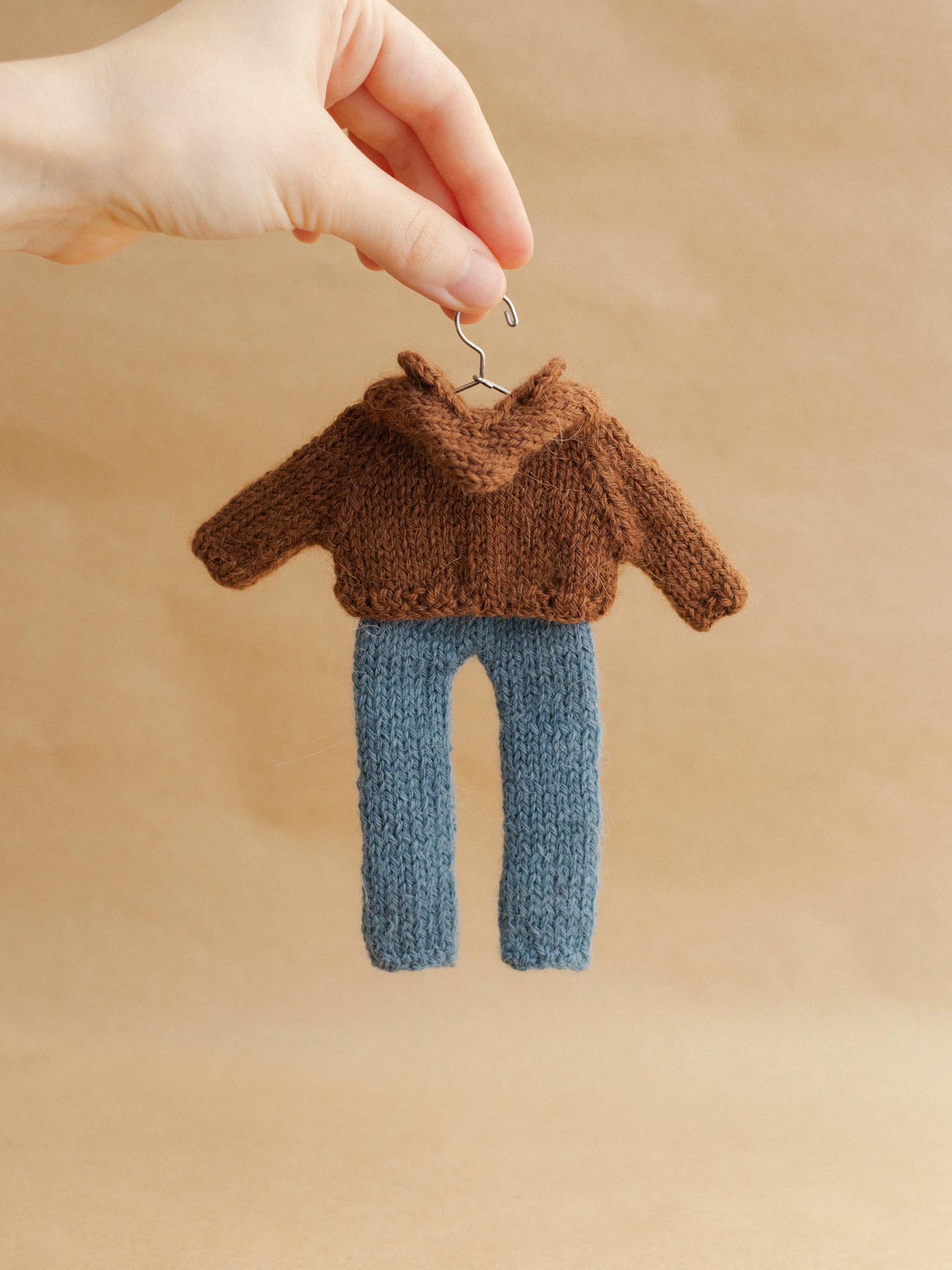 - Bear-Eared Hoodie: A rich brown hand-knitted sweater featuring adorable ears on the hood and a golden-yellow heart embroidered on the chest.