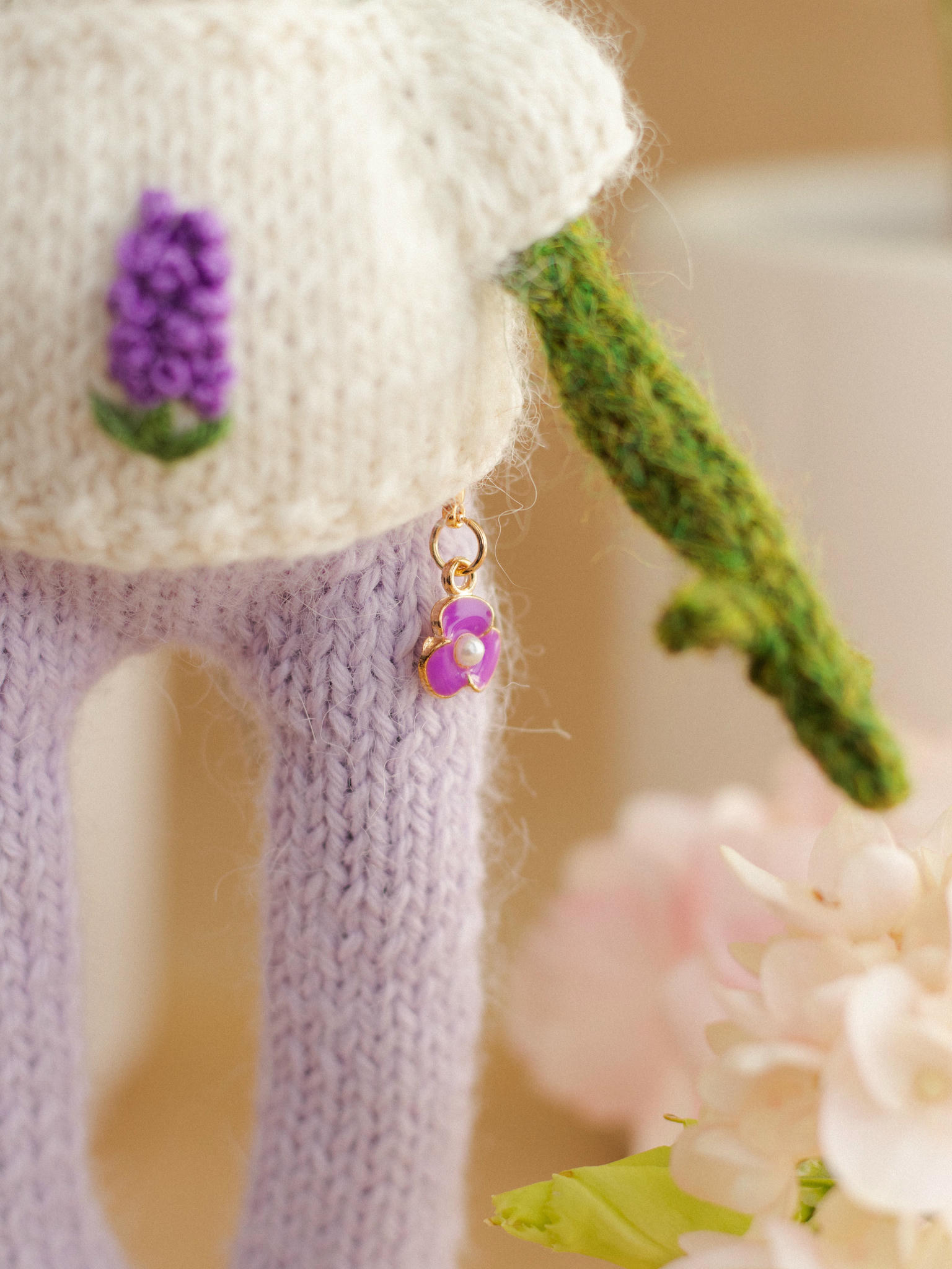 Mr. Hyacinth Frog stands 6.3 inches (approx. 16 cm) tall and brings the serene beauty of a spring meadow right to your shelf. He arrives wearing a meticulously handcrafted outfit shown in the photos — a crisp white short-sleeved sweater featuring a delicate, purple hyacinth embroidery and a pair of perfectly matching lilac knitted trousers.