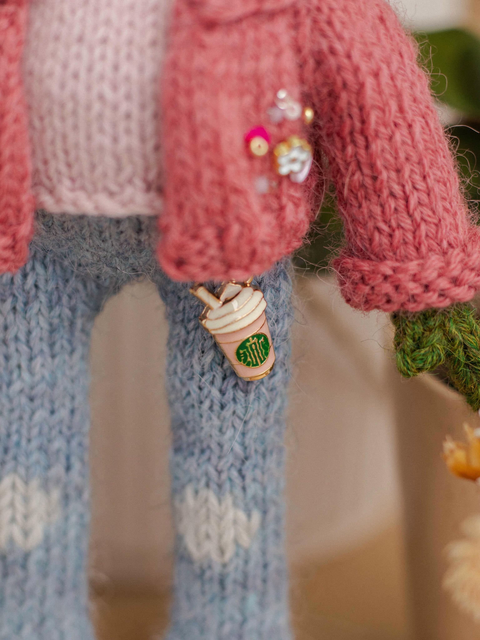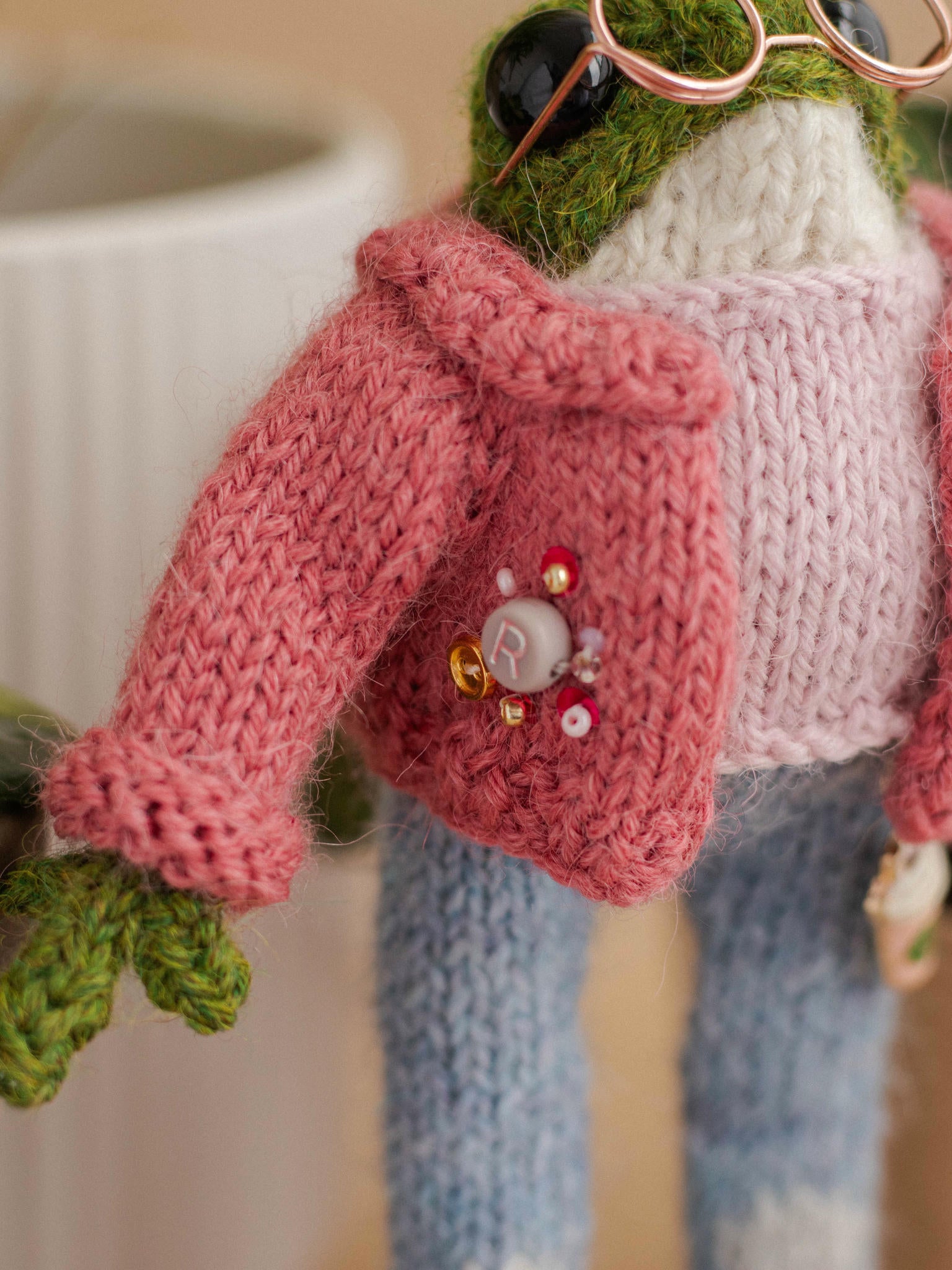 Mr. Retro Frog is 6.3 inches (approx. 16 cm) tall and arrives wearing the impossibly cool outfit shown in the photos — a handcrafted light pink t-shirt, a cozy pink knitted cardigan, and stylish bell-bottom denim-style jeans with slight patches on the knees. This knitted little frog has exactly one hobby: Looking effortlessly cool 😎 Inside his travel box, you’ll also find his double cherry pendant, classic white sneakers, favorite wire-frame glasses, and a few small gifts prepared especially for you ❤️