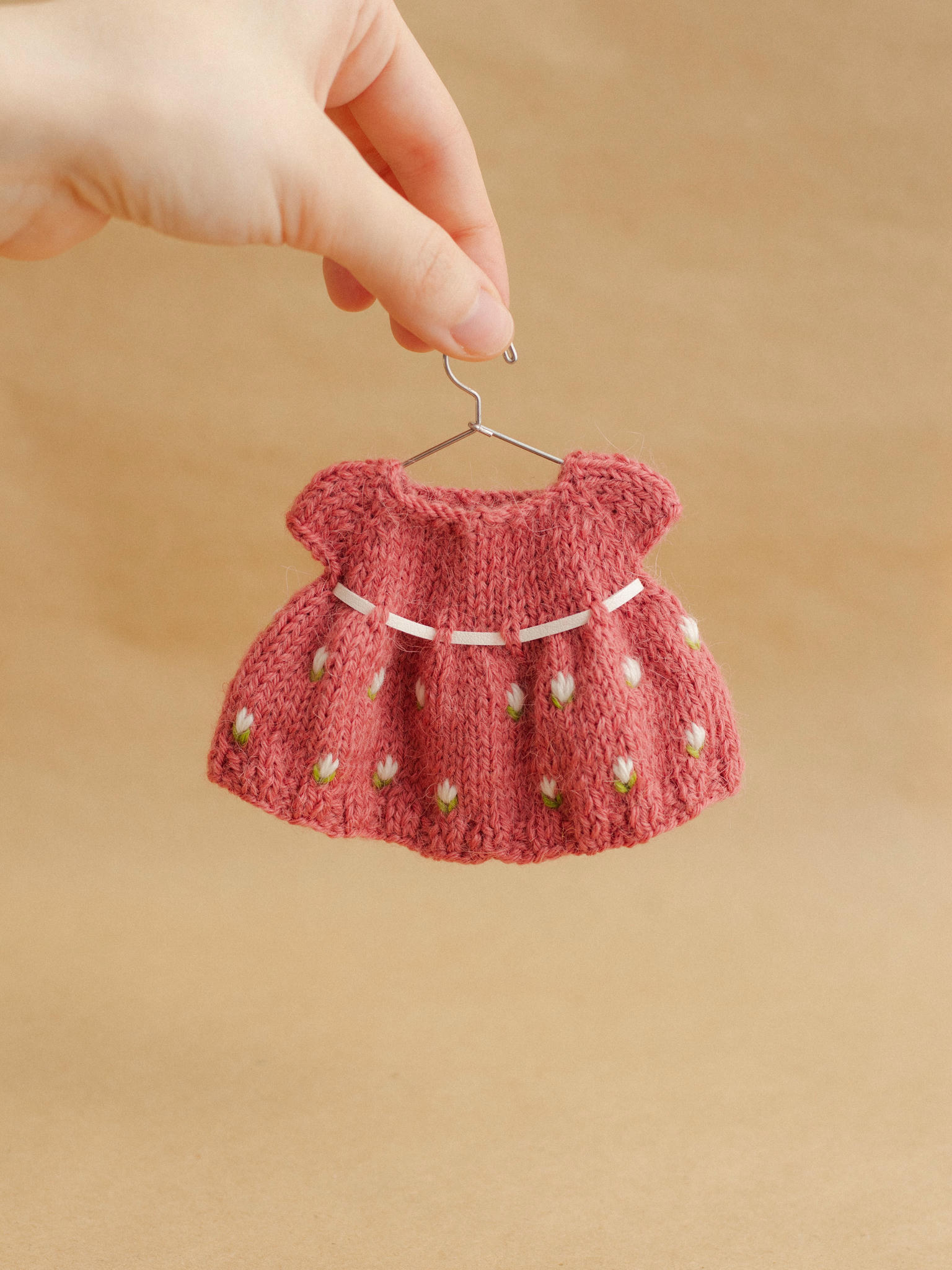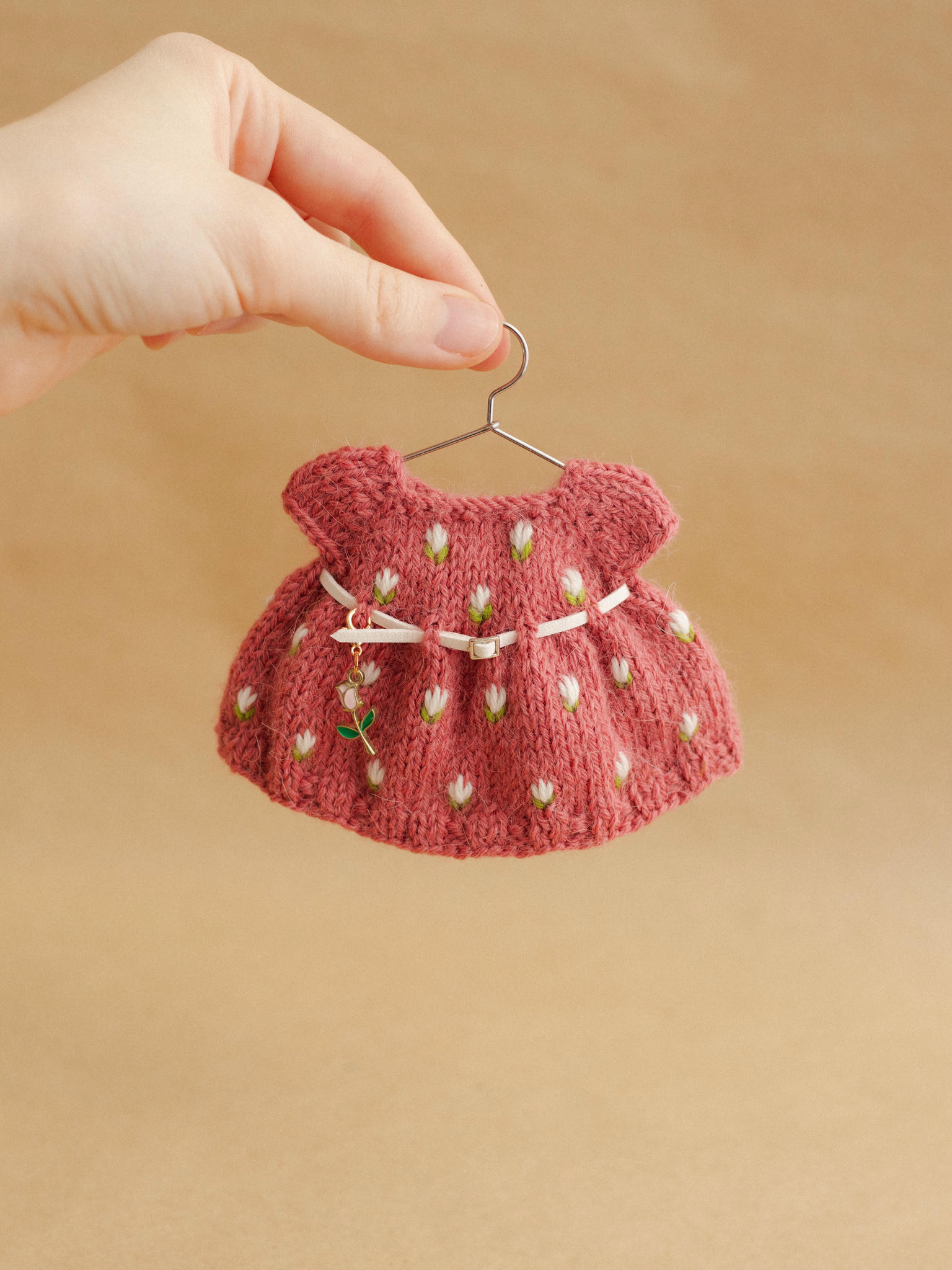 - Embroidered Snowdrop Dress: A soft, rose-pink knitted dress adorned with beautiful white snowdrop buds and a delicate white belt.