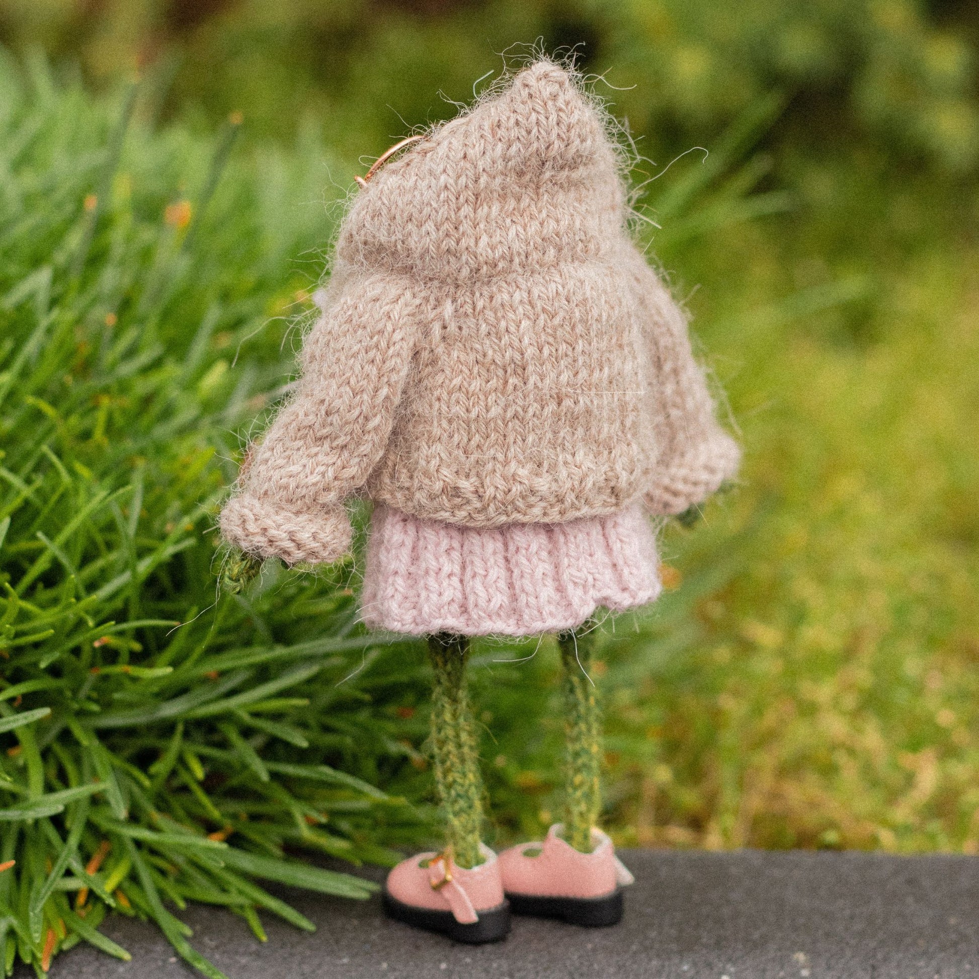 A cozy open front hoodie knitting pattern designed for a 5.1-inch (13 cm) knitted frog.