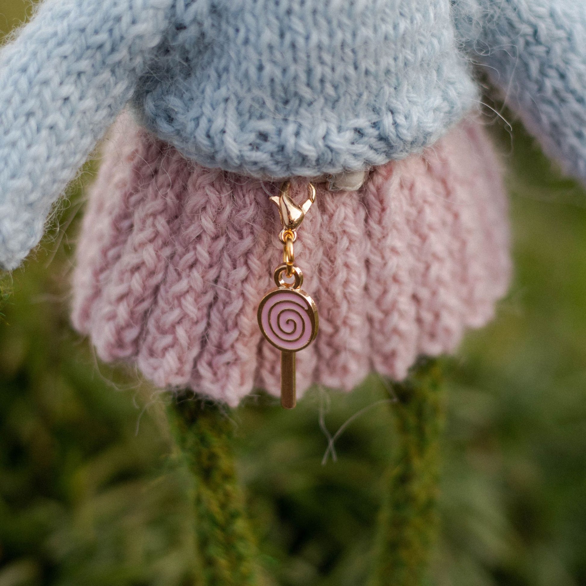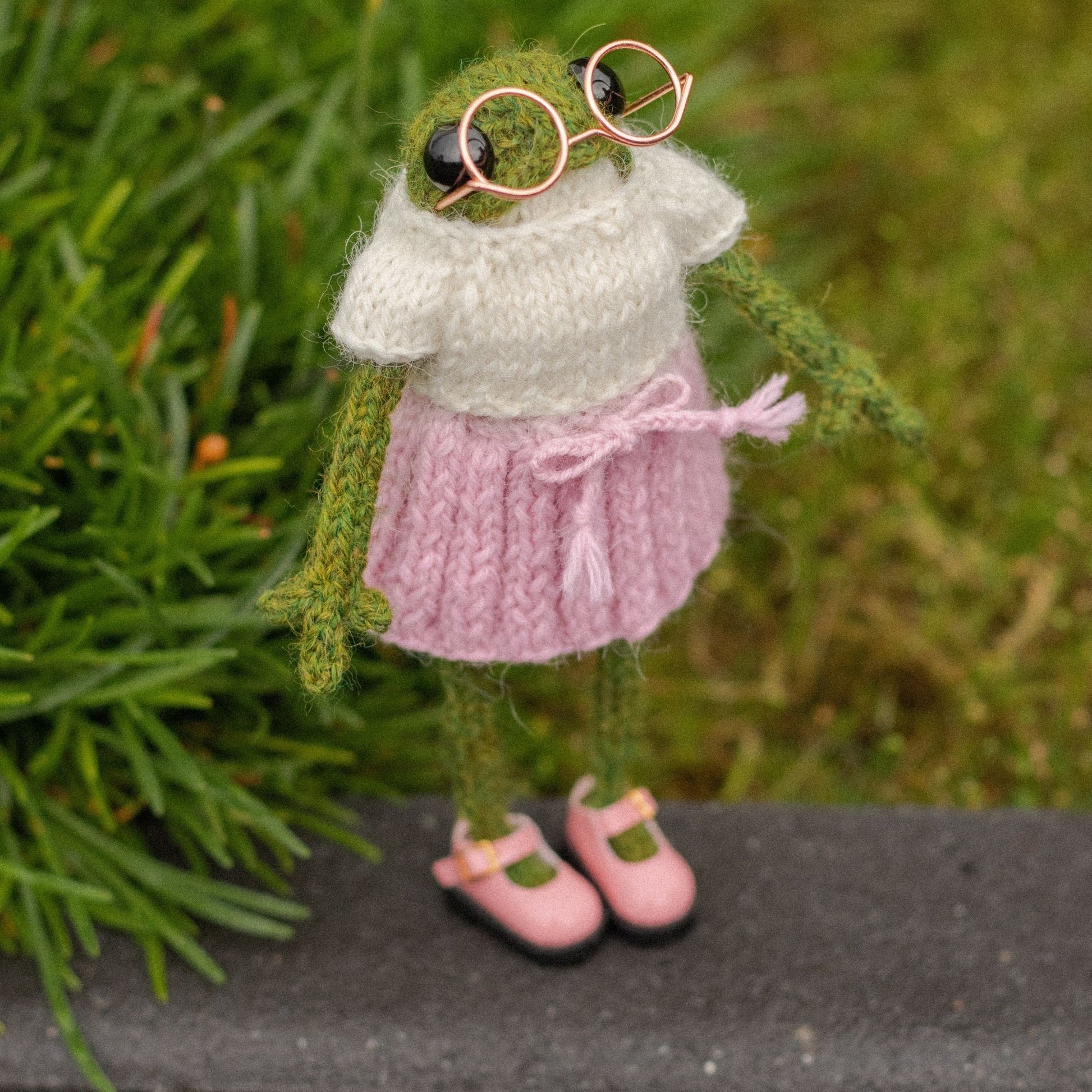 A stylish pleated skirt knitting pattern designed for a 5.1-inch (13 cm) knitted frog.