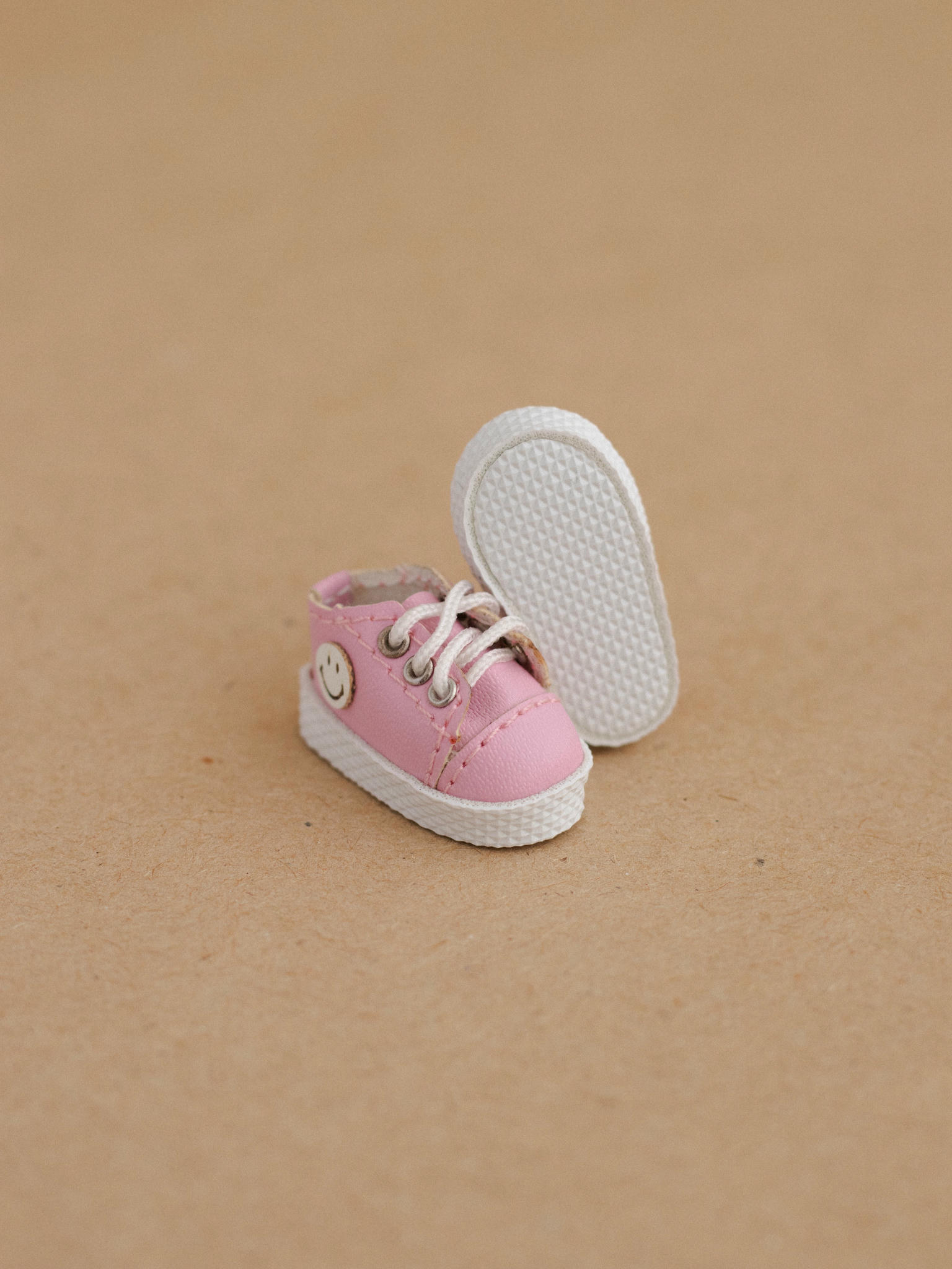 These essential Smile Pink Sneakers are the ultimate staple for your collectible’s wardrobe. With their clean lines and minimalist design, they offer a timeless look that pairs perfectly with any outfit your handmade friend chooses to wear. Each shoe features a cheerful white smiley face label on the side, adding a playful and soulful touch to your favorite frog's journey.